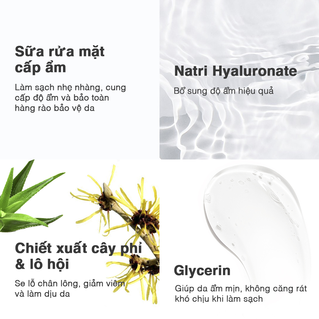 Sản phẩm chứa Axit Hyaluronic cùng Vitamin C, E giúp cấp nước mạnh mẽ, cải thiện tông da và mang lại cảm giác mềm mịn ngay sau khi sử dụng.