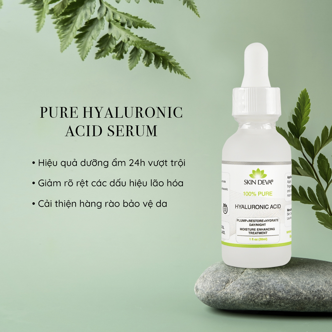 Sử dụng 100% thành phần nguyên chất và đảm bảo chất lượng theo tiêu chuẩn Hoa Kỳ, Serum Skin Deva 100% Pure Hyaluronic Acid giúp cấp nước, dưỡng ẩm hiệu quả suốt 24h.