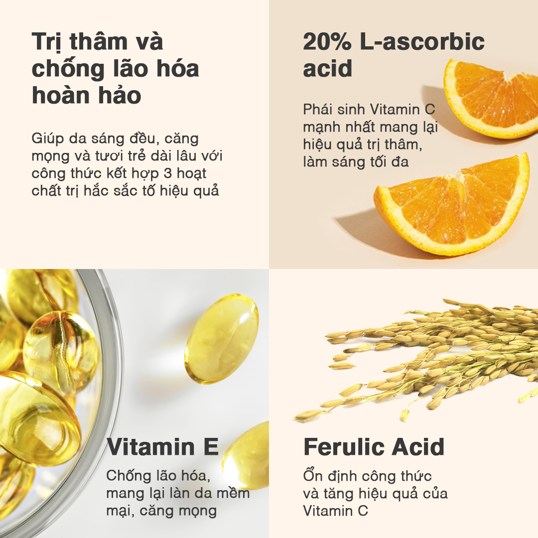 Công thức serum vitamin C này sử dụng bộ 3 hoàn hảo, nổi tiếng hiệu quả nhất trong lĩnh vực trị thâm bởi: